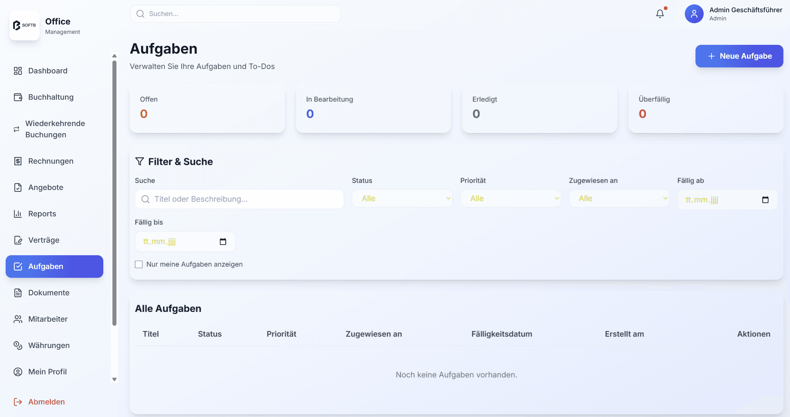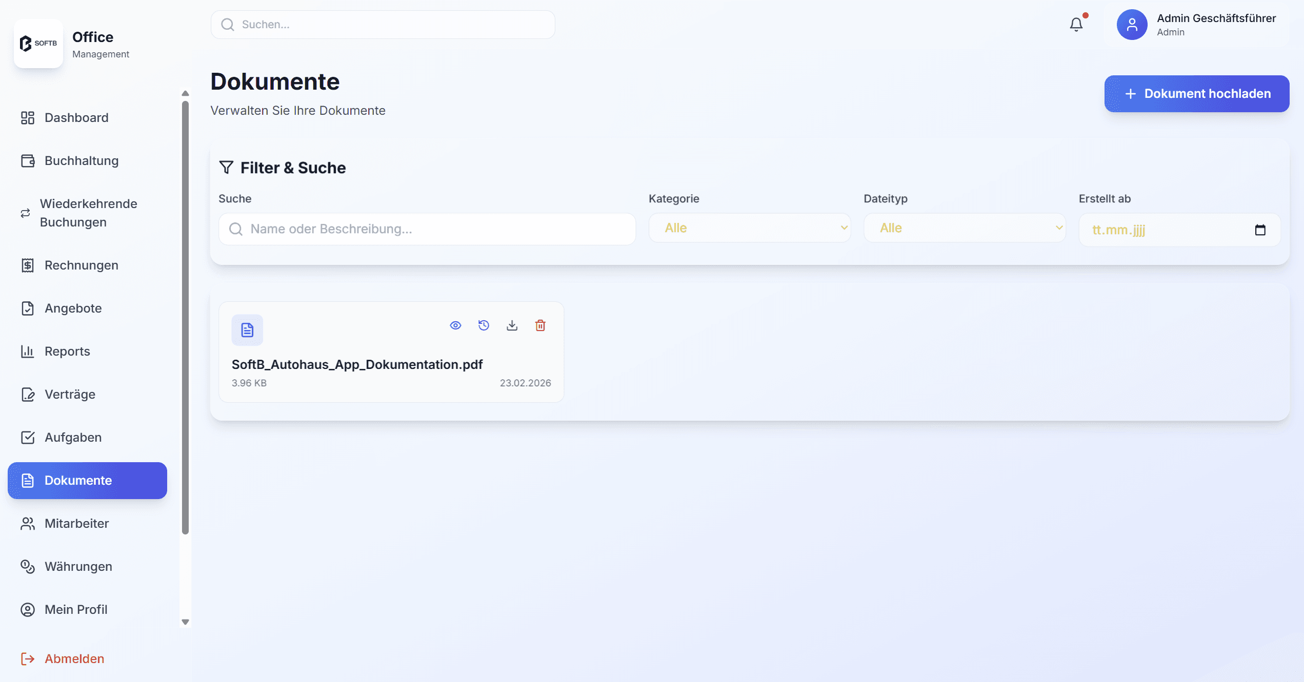 SoftB-Büroverwaltung bietet eine browserbasierte Lösung für kleine und mittelständische Unternehmen, um Buchhaltung, Rechnungswesen, Dokumentenverwaltung und Aufgabenkoordination effizient zu steuern. Die Anwendung nutzt eine Microservice-Architektur, unterstützt rollenbasierte Zugriffe und ermöglicht eine zentrale Datenpflege. Sie reduziert Medienbrüche, vereinfacht Arbeitsabläufe und schafft eine einheitliche Arbeitsumgebung für Teams.